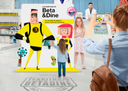 Beta y Dine son personajes con poderes que corresponden a los atributos y ventajas competitivas del producto. Los niños deben ayudar a que los personajes neutralicen a las bacterias en un juego interactivo que combina piezas físicas con elementos digitales. Ganamos: Visibilidad en PDV - Recodatorio de Marca - Formación sobre el producto